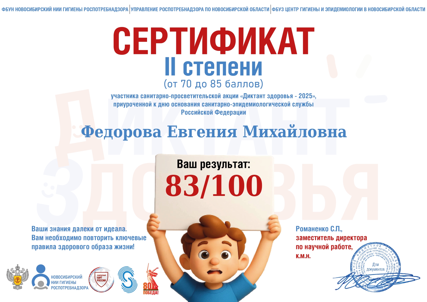 Сертификат 2 степени  участника  санитарно - просветительской акции "Диктант здоровья - 2025" приуроченной к дню основания  санитарно  - эпидемилогической службы РФ