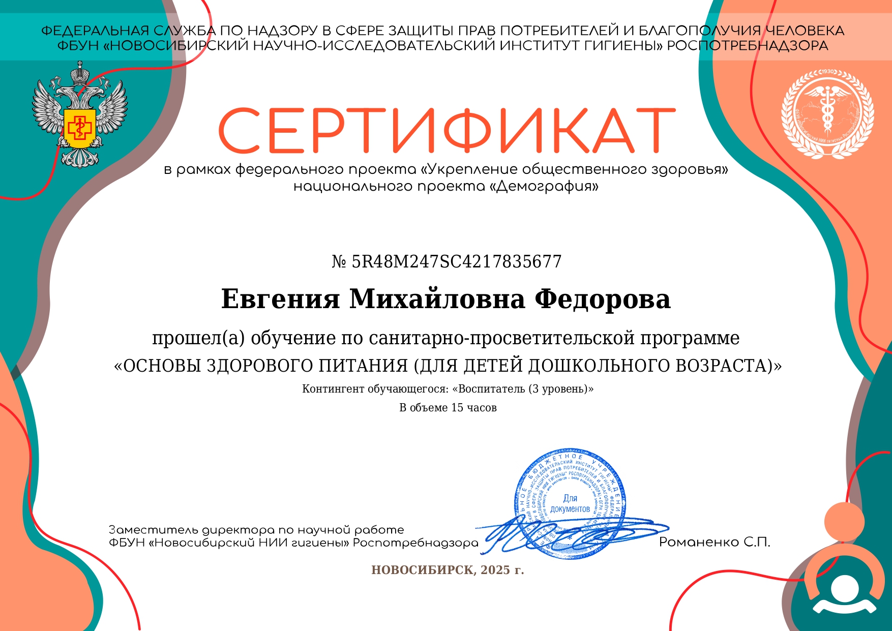 Сертификат об прохождении обучение по санитарно - просветительской программе "Основы здорового питания" (для детей дошкольного возраста) 2025